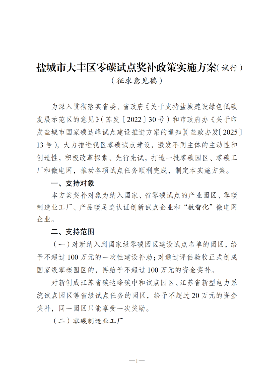为贯彻落实省委、省政府《关于支持盐城建设绿色低碳发展示范区的意见》(苏发〔2022〕30号)和市政府办《关于印发盐城市国家碳达峰试点建设推进方案的通知》(盐政办发〔2025〕13号)文件精神,根据区委、区政府推进我区零碳试点建设,打造零碳园区、零碳工厂和微电网工作指示,我委牵头起草了《盐城市大丰区零碳试点奖补政策实施方案(试行)(征求意见稿)》。现向公众征求意见建议,希望通过广泛的意见征集,提升文件的科学性和合理性。