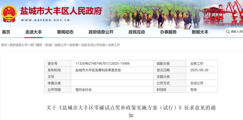 关于《盐城市大丰区零碳试点奖补政策实施方案(试行)》征求意见的通知