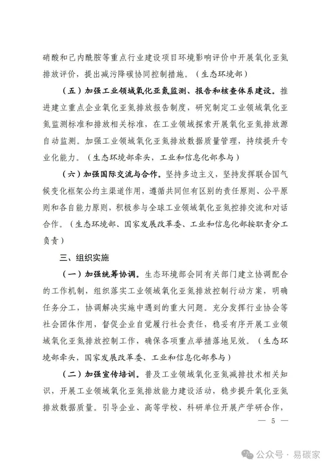 五是加强工业领域氧化亚氮监测、报告和核查体系建设。推进建立重点企业氧化亚氮排放报告制度,研究制定监测标准和排放相关标准,在工业领域探索开展氧化亚氮排放源自动监测。加强数据质量管理,持续提升专业化能力。