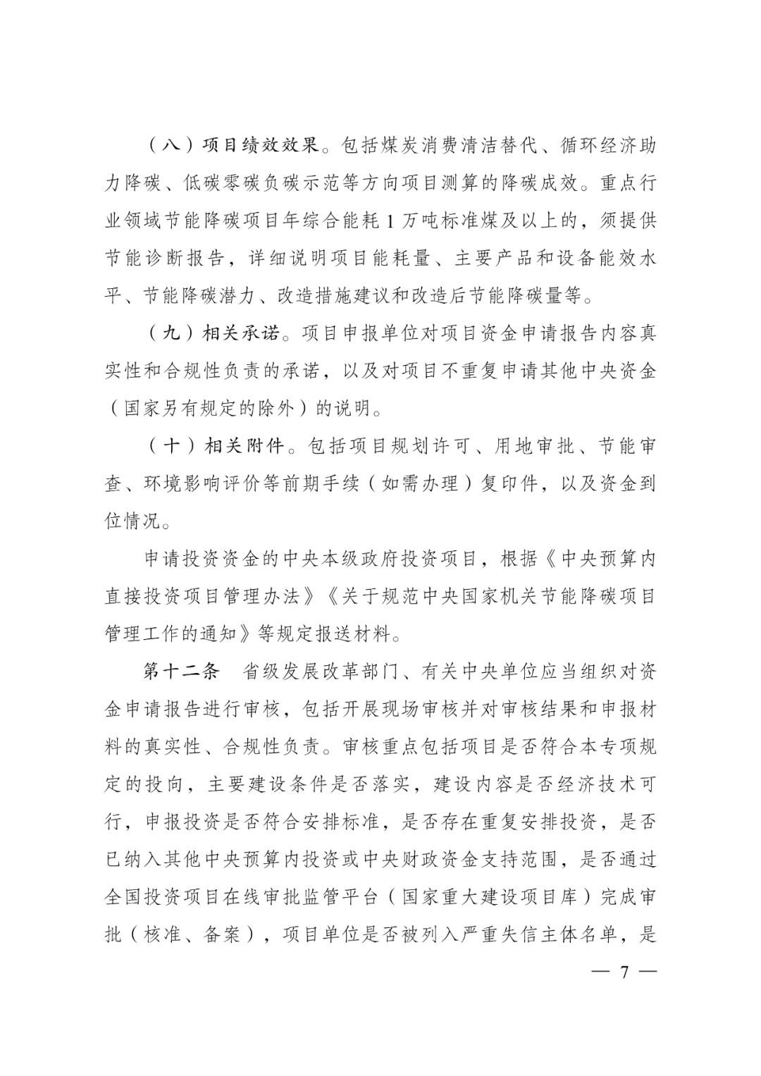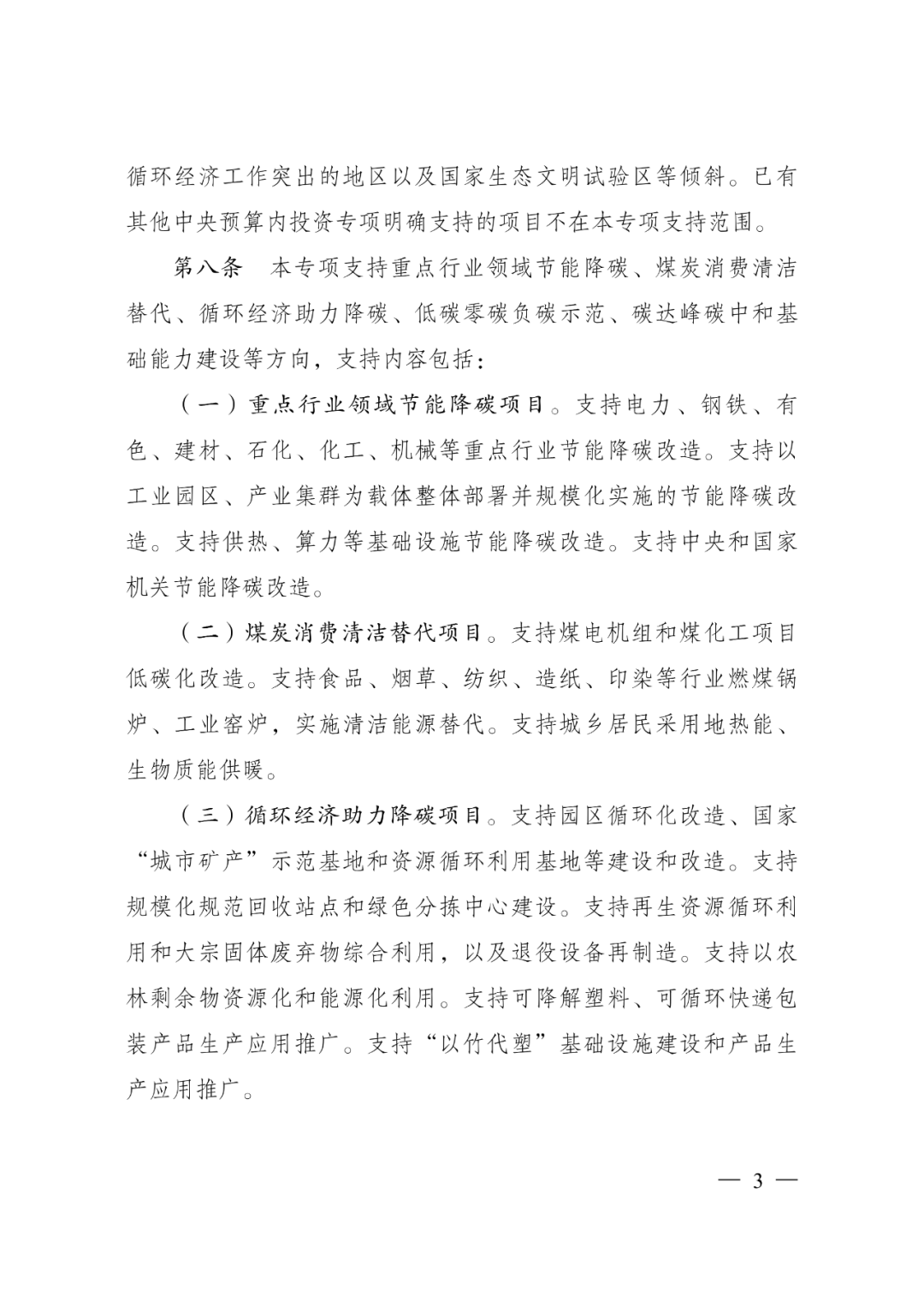 专项支持重点行业领域节能降碳、煤炭消费清洁替代、循环经济助力降碳、低碳零碳负碳示范、碳达峰碳中和基础能力建设等方向。