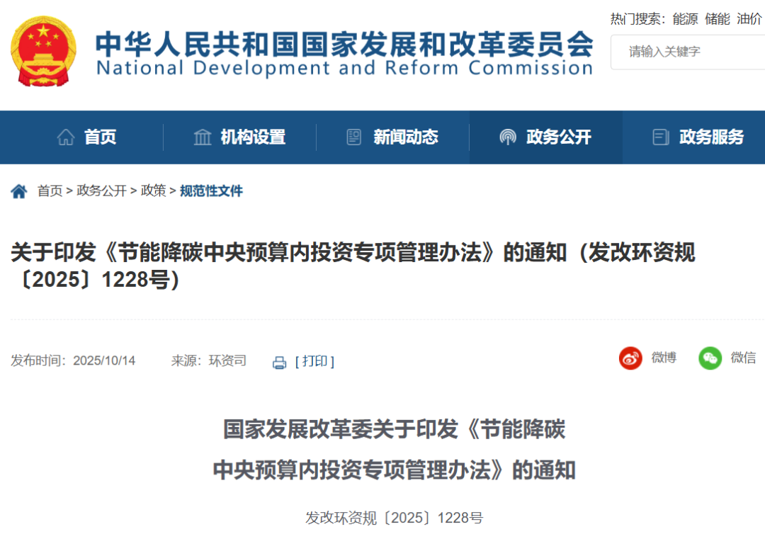 10月14日,国家发改委发布关于印发《节能降碳中央预算内投资专项管理办法》的通知。
