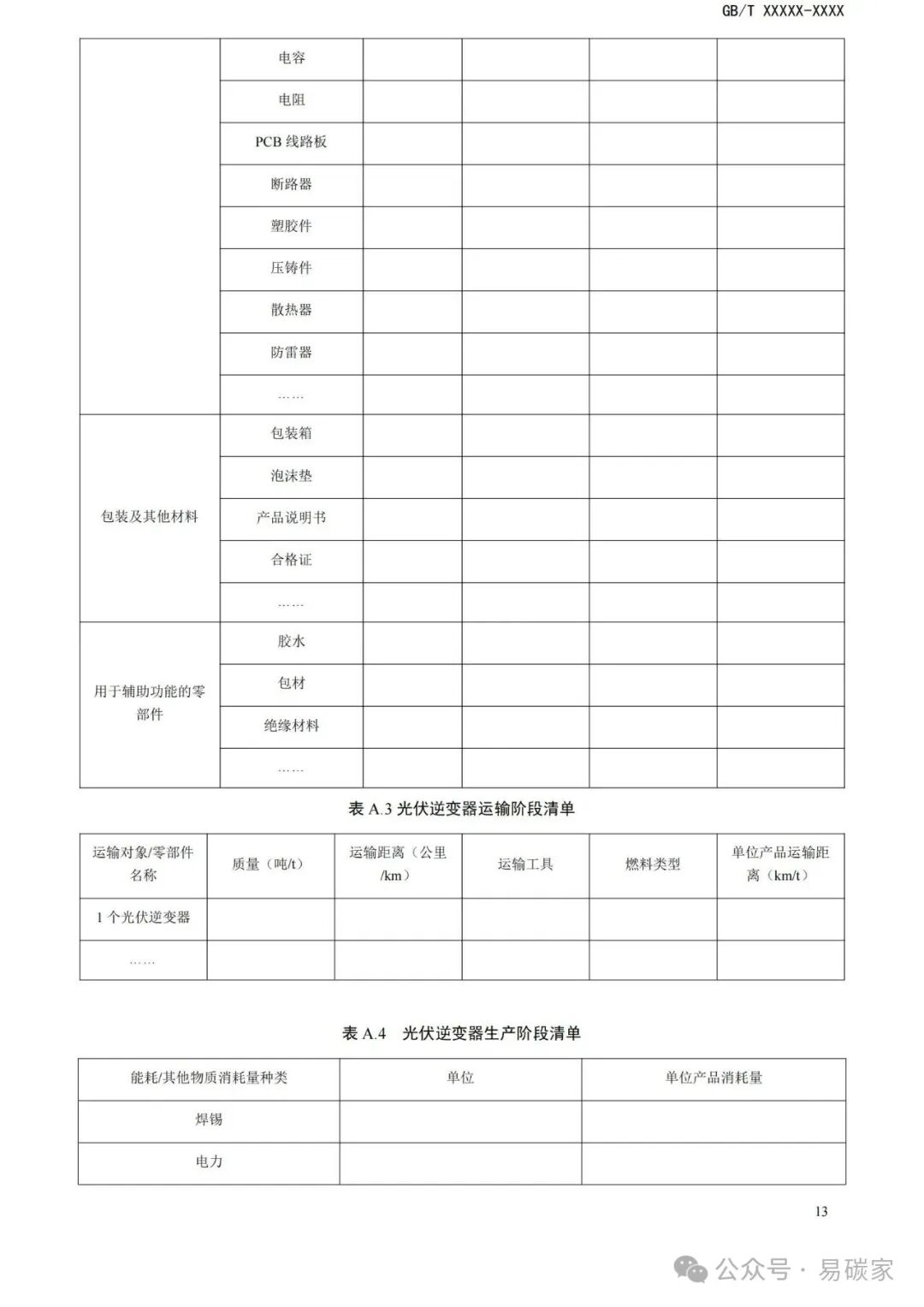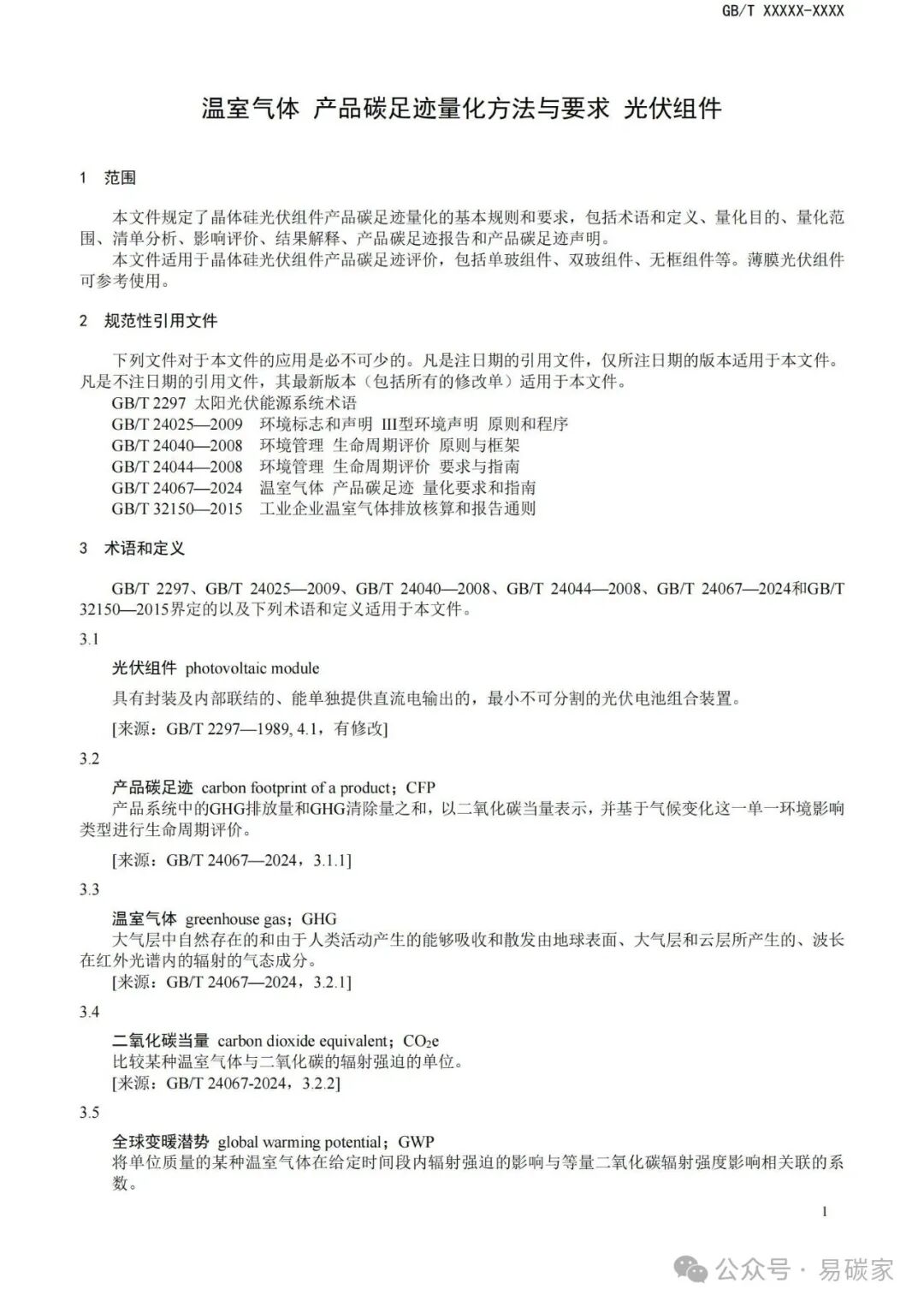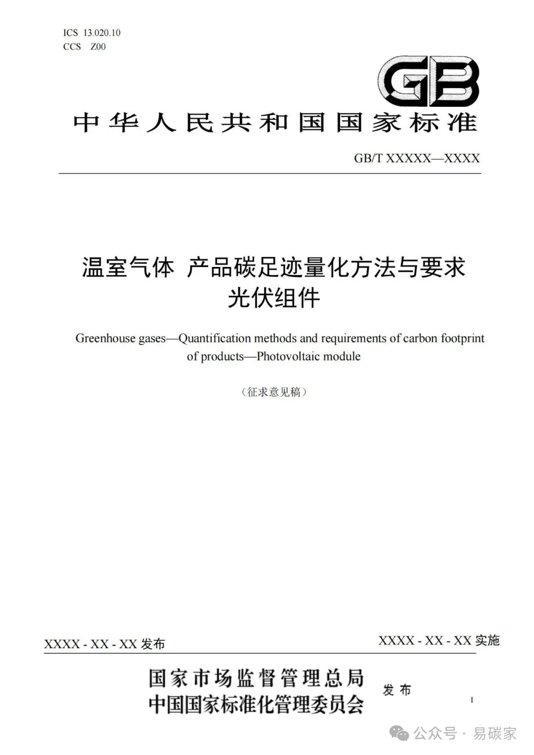 由全国碳排放管理标准化技术委员会归口的国家标准项目《温室气体 产品碳足迹量化方法与要求 光伏逆变器》(计划号:20243774-T-467)、《温室气体 产品碳足迹量化方法与要求 光伏组件》(计划号:20243771-T-467)已通过批准立项。目前起草组已完成标准征求意见稿(附件1、附件2)。