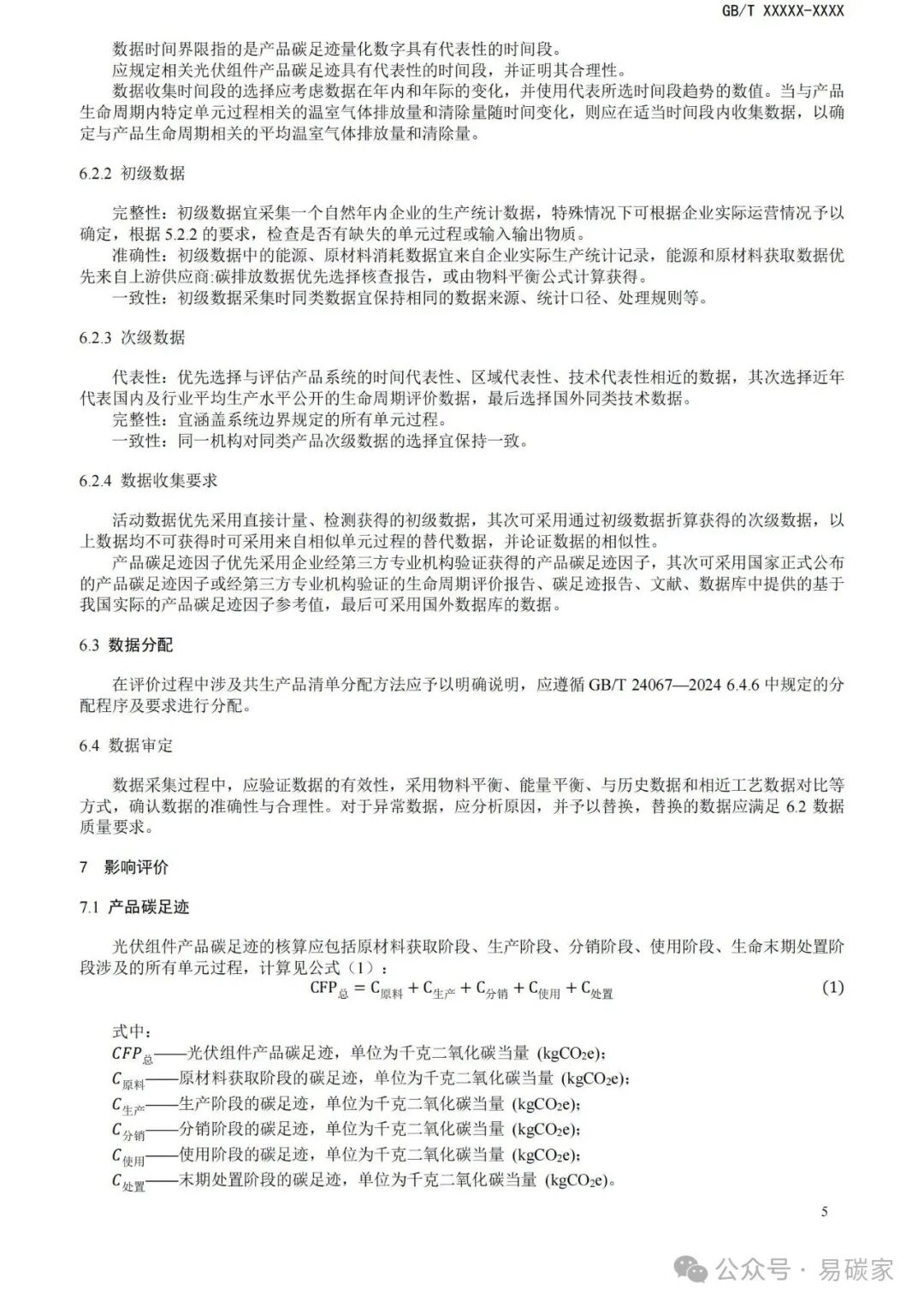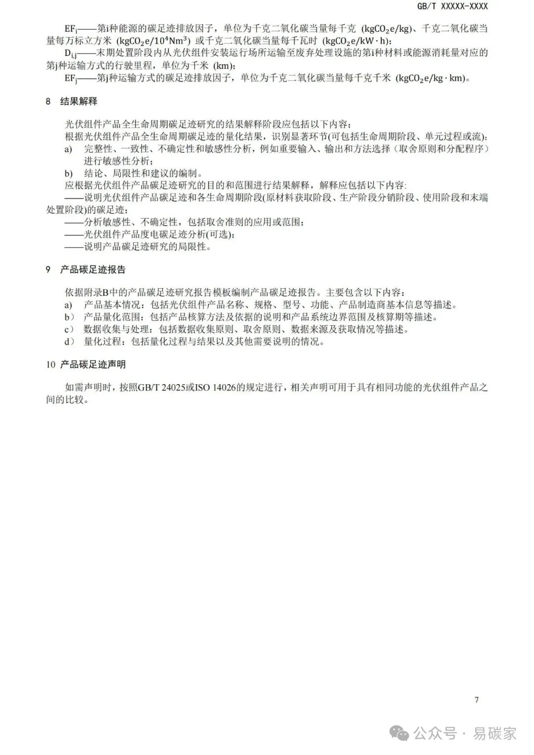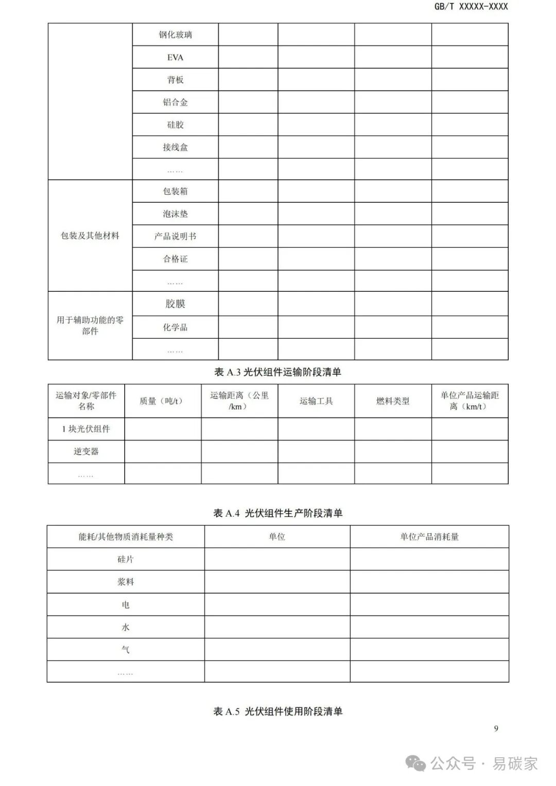 由全国碳排放管理标准化技术委员会归口的国家标准项目《温室气体 产品碳足迹量化方法与要求 光伏逆变器》(计划号:20243774-T-467)、《温室气体 产品碳足迹量化方法与要求 光伏组件》(计划号:20243771-T-467)已通过批准立项。目前起草组已完成标准征求意见稿(附件1、附件2)。