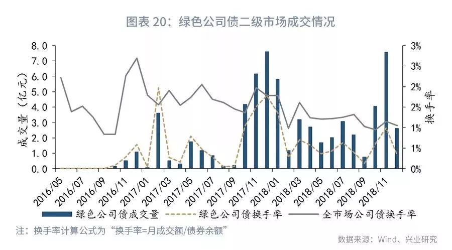 绿色企业债券和绿色公司债券二级市场流动性低相对较低。2018年全年,绿色企业债和绿色公司债成交额分别为212.28亿元和36.89亿元。从换手率来看,2017年后,绿色企业债换手率趋于平稳,2018年全年换手率为3.14%, 2017~2018年绿色企业债换手率平均低于全市场企业换手率1.7个百分点。绿色公司债换手率同样低于市场水平,2016~2018年间绿色公司债换手率平均低于全市场公司债换手率1个百分点。